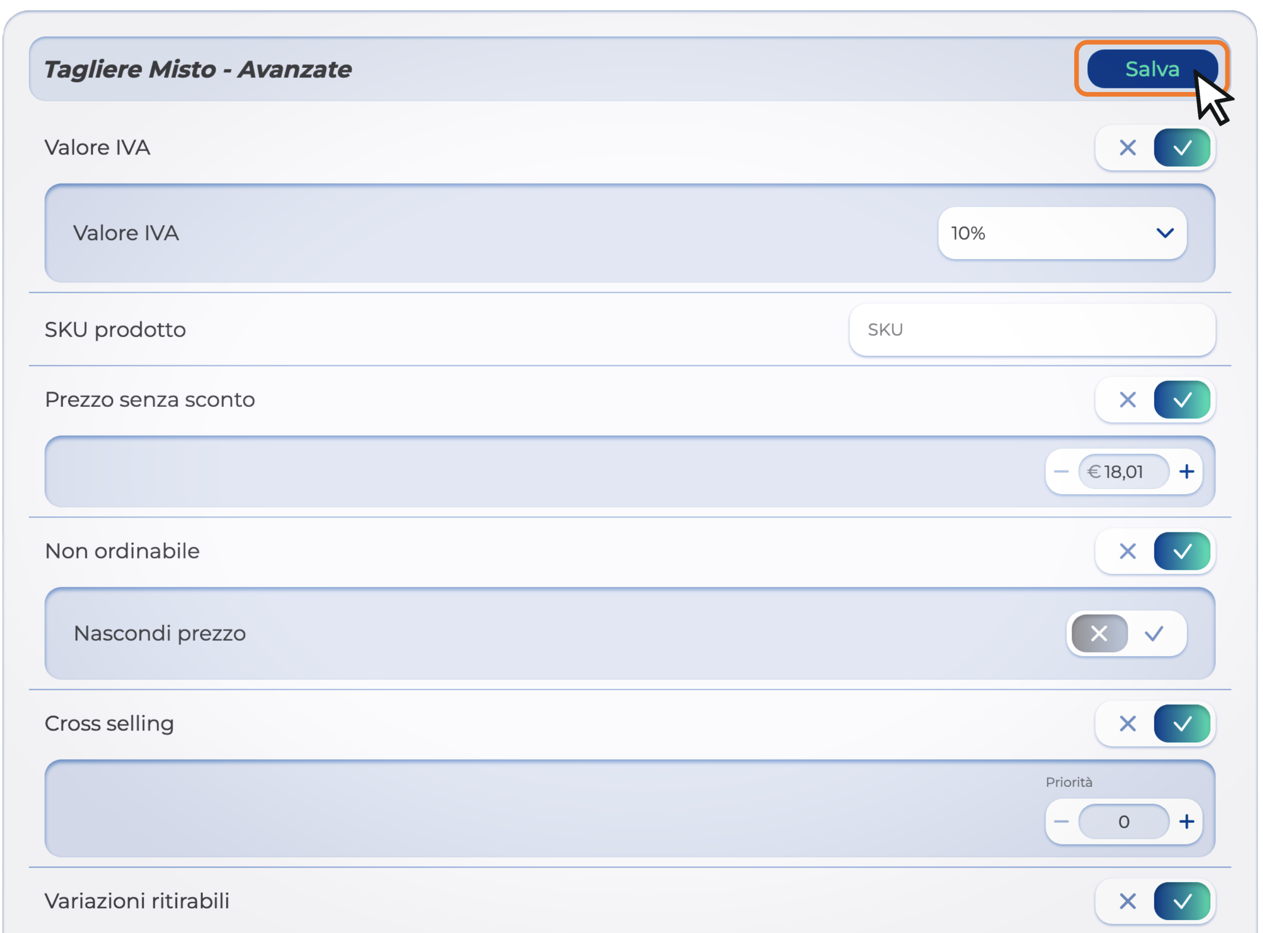 - Valore IVA: scegli di assegnare dei valori IVA in base al prodotto