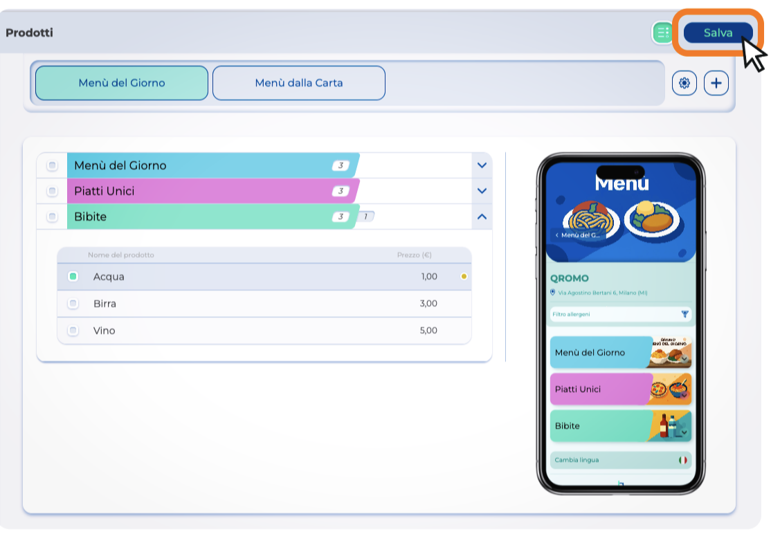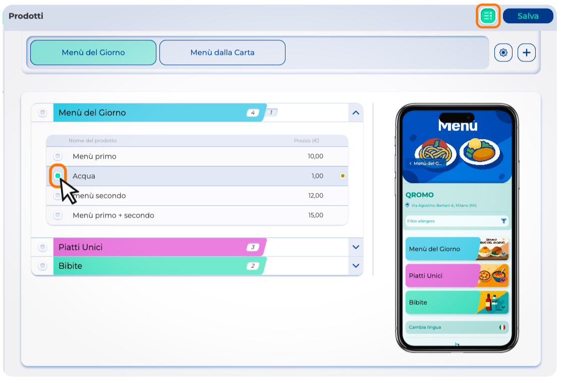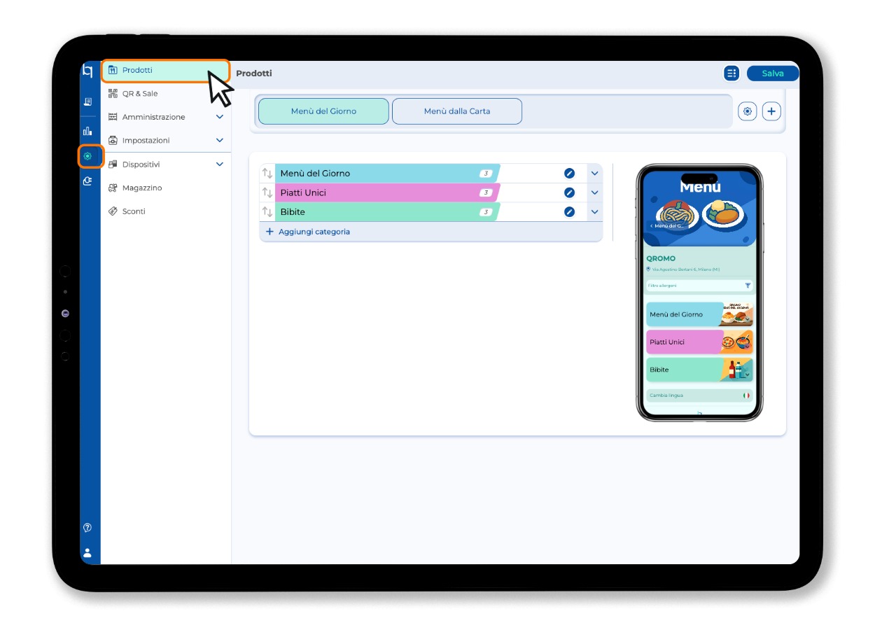 1. Accedi a Qromo, clicca sull’icona "⚙️" e apri la sezione Prodotti.