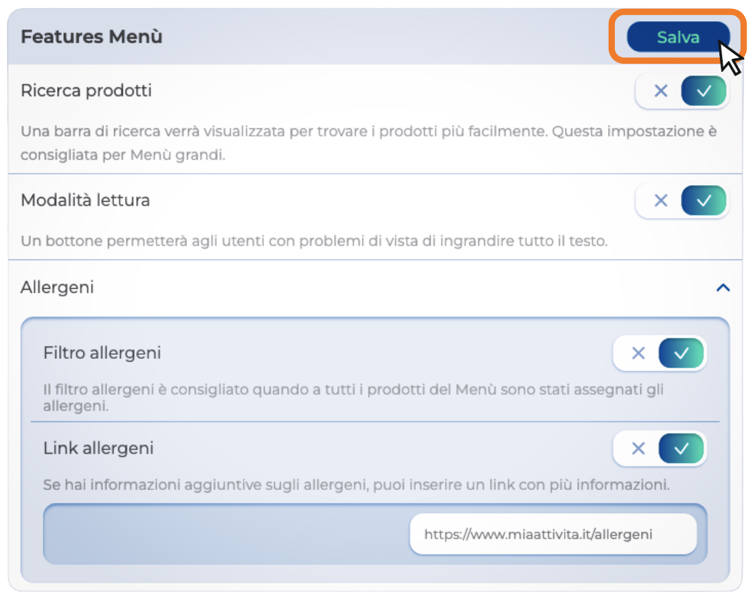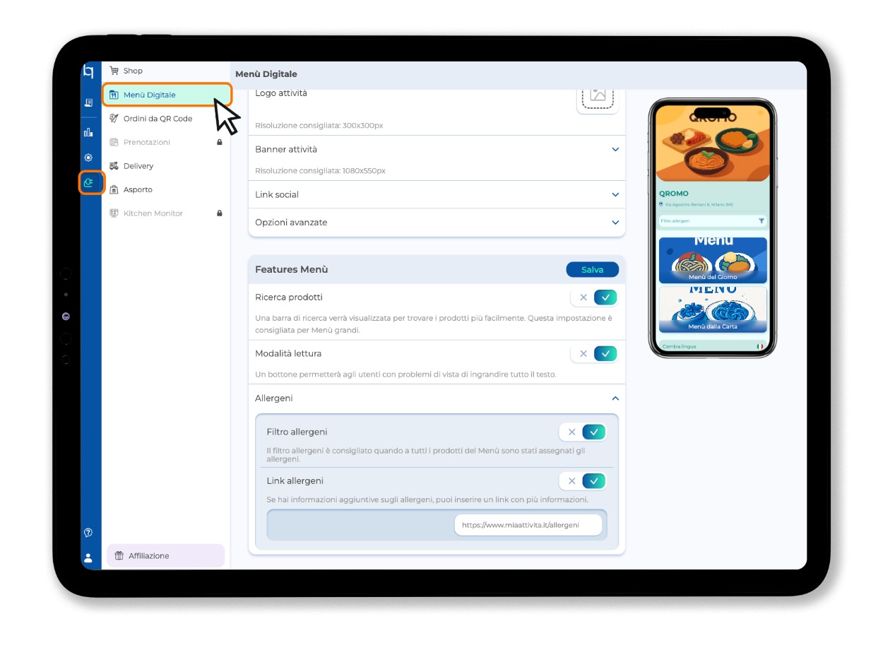 In questa sezione puoi attivare funzioni aggiuntive che migliorano l’esperienza dei clienti durante la consultazione del menù.