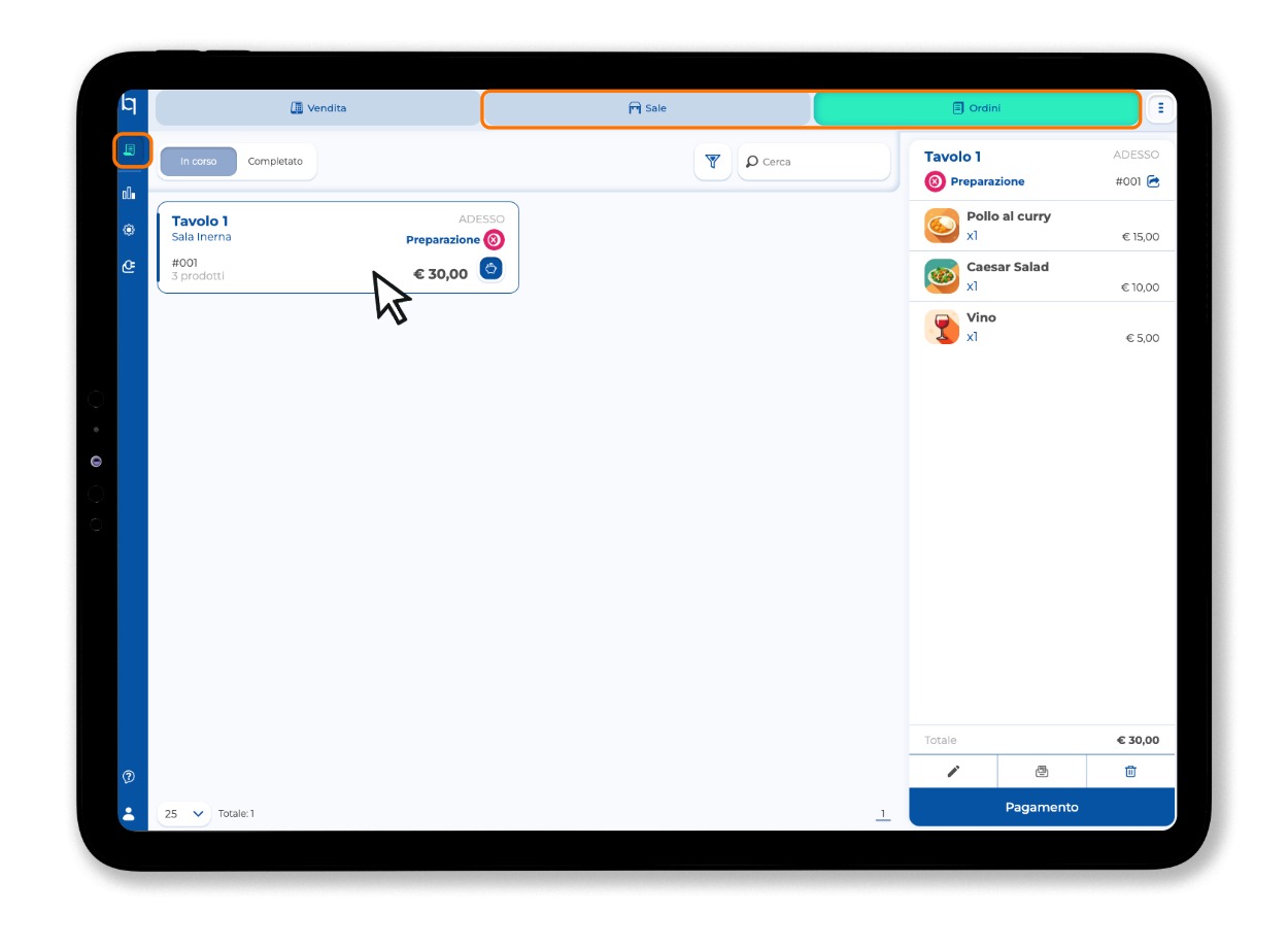 1. Accedi alla sezione operativa, nello specifico nella sezione ordini ed individua l'ordine che vuoi modificare. Oppure seleziona l'ordine dal tavolo dalla sala.