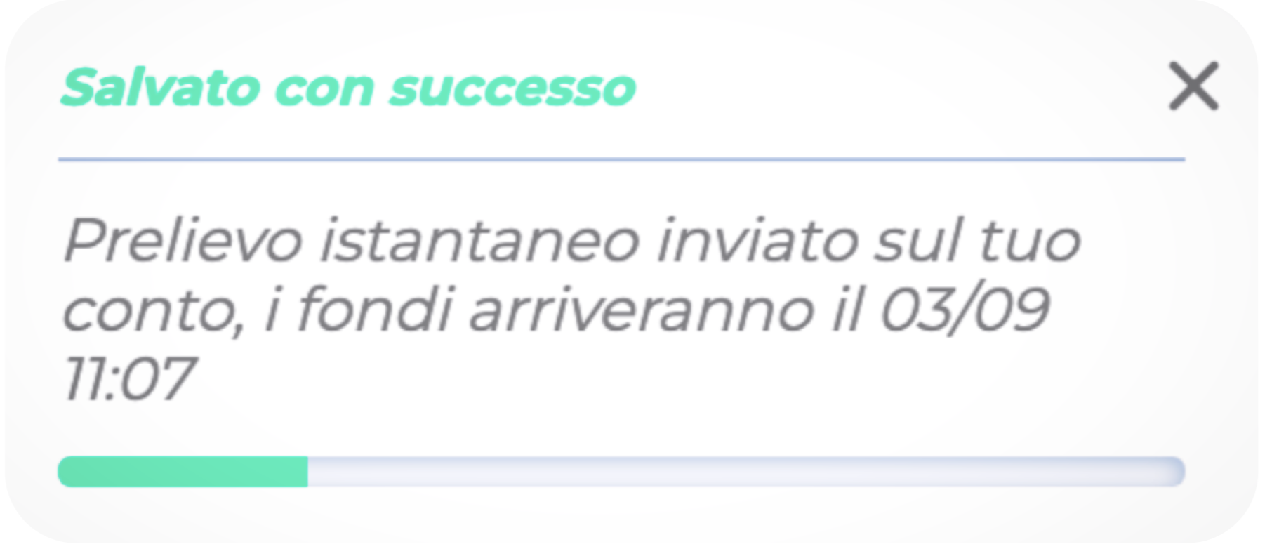 5. Verifica il successo. Per assicurarti che il prelievo sia andato a buon fine, controlla in alto a destra: se tutto è andato liscio apparirà un banner con la scritta "Prelievo istantaneo inviato sul tuo conto, i fondi arriveranno in data xyz"