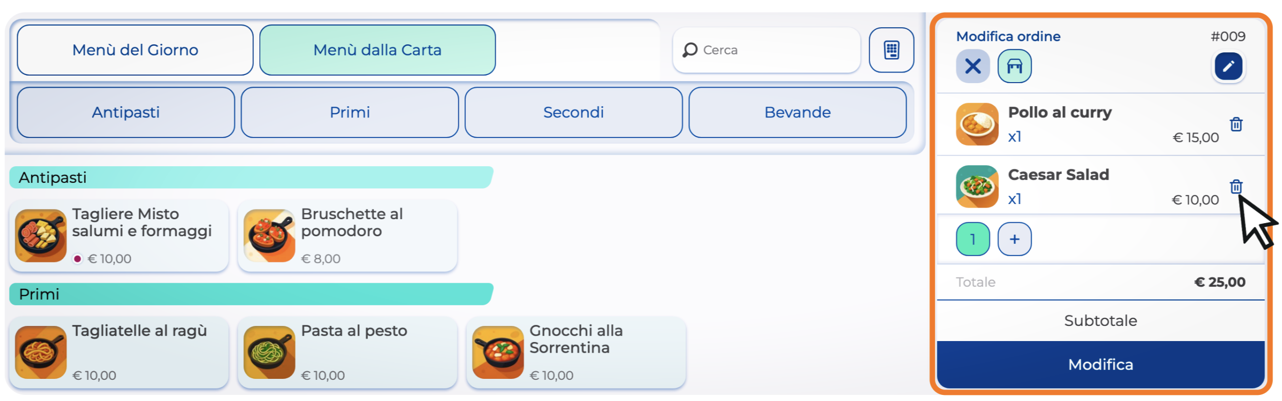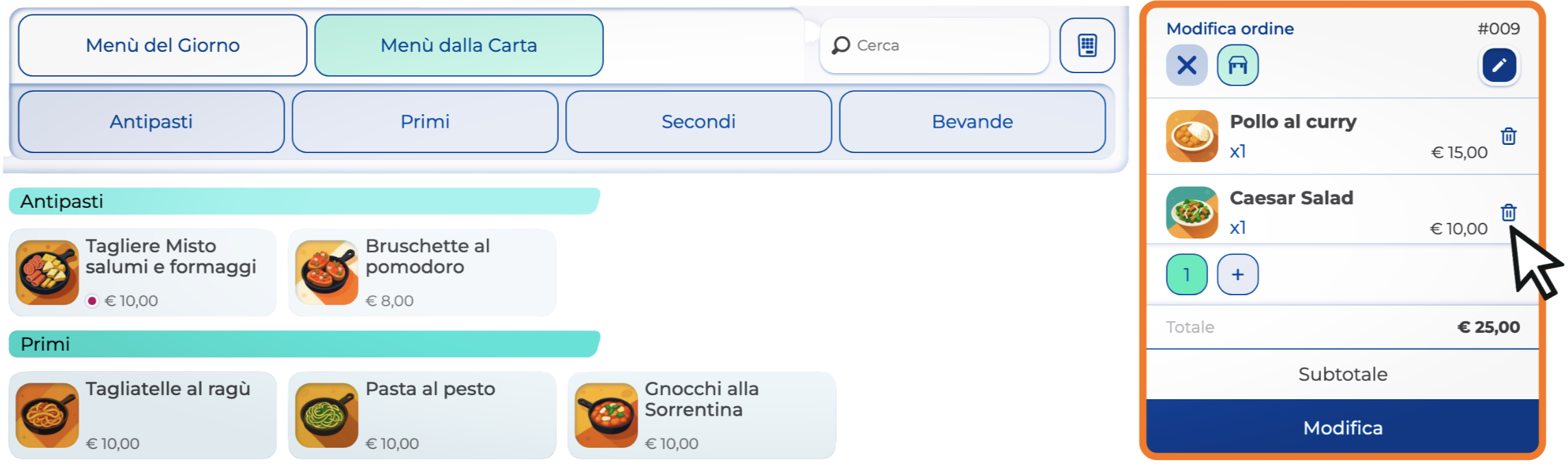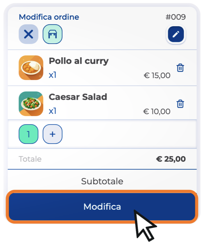 Ora puoi aggiungere un prodotto selezionandolo direttamente dalla vendita banco, rimuoverlo cliccando sull’icona del cestino accanto a ogni prodotto, aggiungere una nota all’intero ordine o al singolo prodotto, cambiare la portata del prodotto oppure modificare il tavolo dell’ordine.