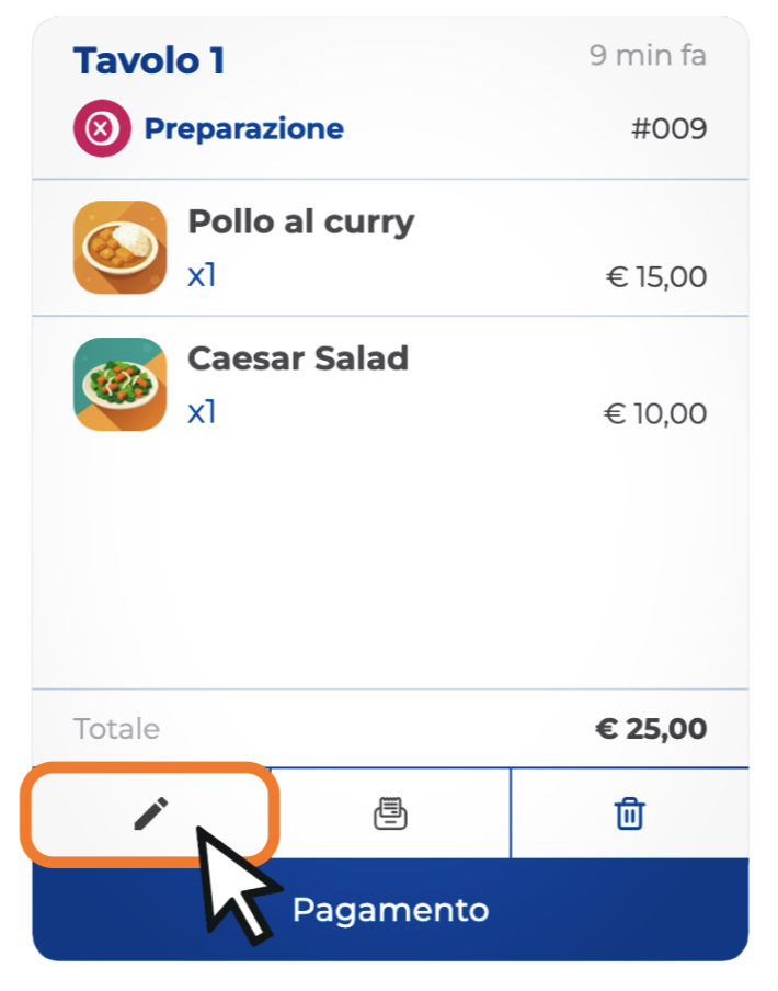 2. Trova il tavolo dell’ordine che vuoi modificare e clicca sull’icona blu della matita.