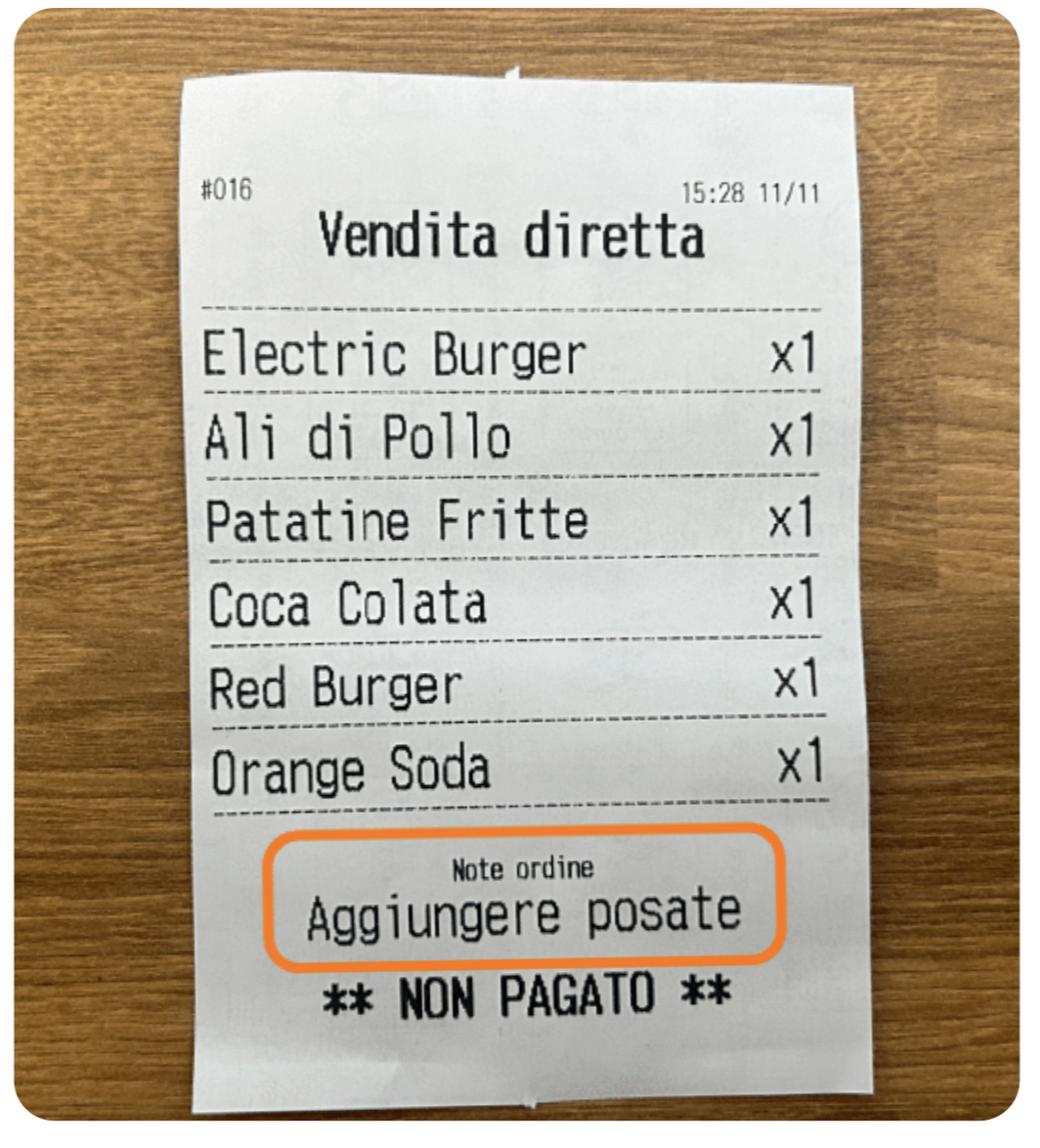 La nota verrà stampata nella comanda, bene visibile in basso.