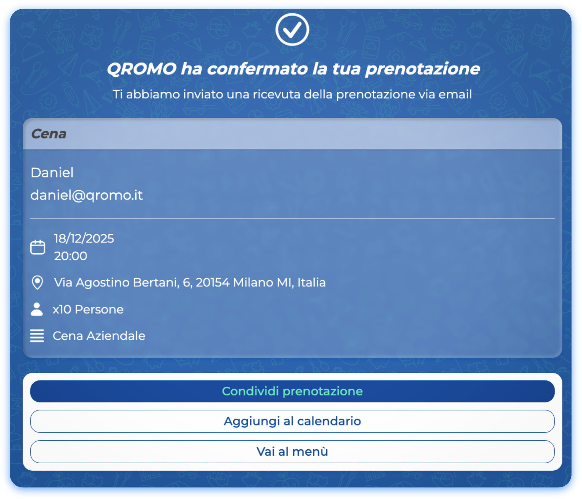 Il cliente potrà scegliere anche di aggiungere l'evento al calendario, condividere la prenotazione, oppure scoprire il menù.