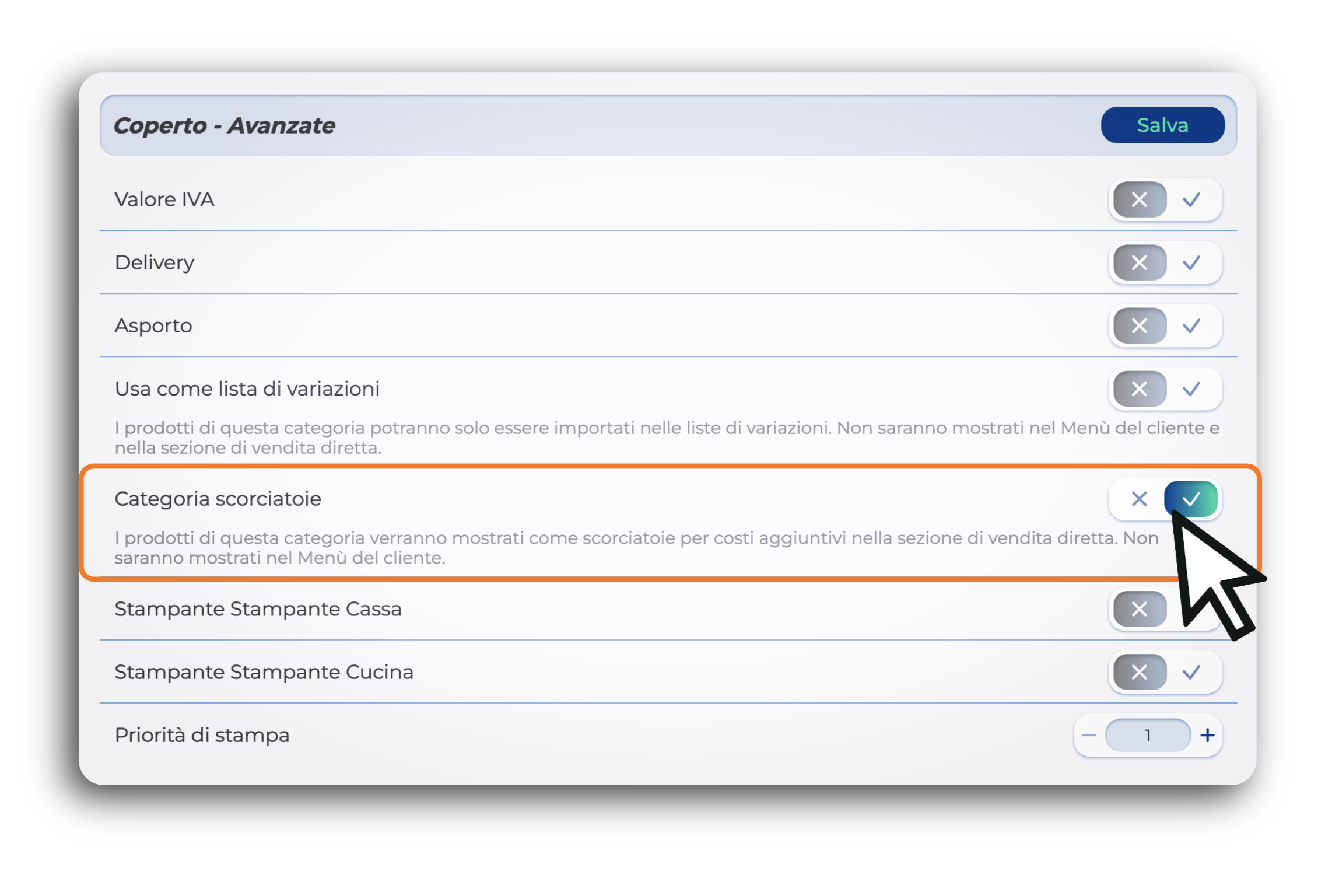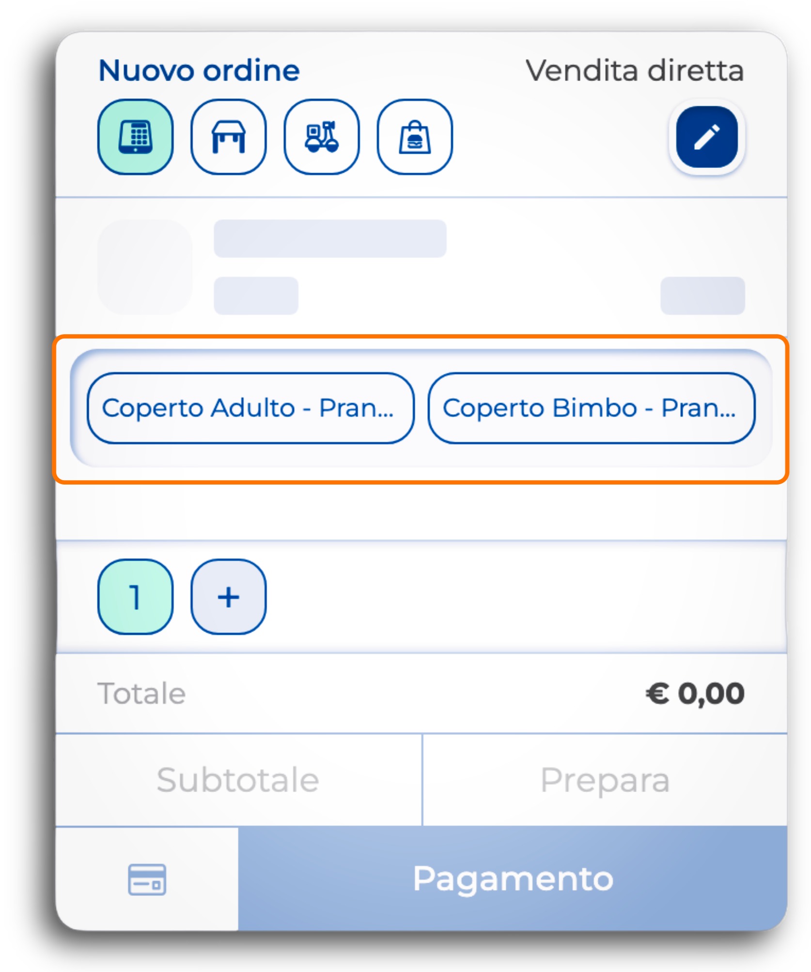 Se hai un importo fisso per il coperto, puoi impostare direttamente la voce Coperto nelle impostazioni della sala. In questo modo verrà applicato automaticamente agli ordini senza bisogno di creare scorciatoie nel menù. CLICCA QUI per vedere l'impostazione classica