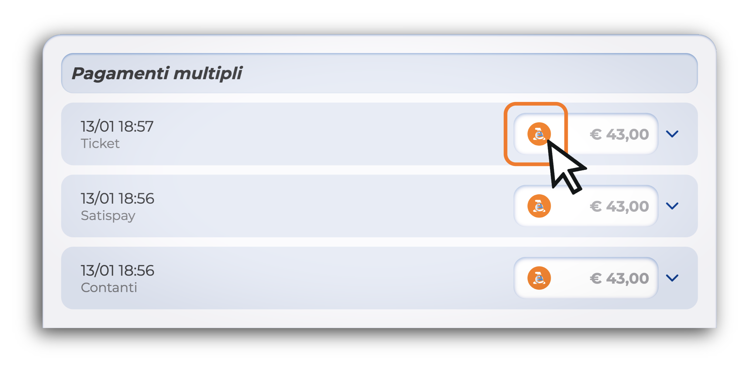 3. Individua la transazione specifica che vuoi ristampare e fai click sull'icona dello scontrino che trovi posizionata accanto al logo dell'Agenzia delle Entrate, oppure direttamente sul simbolo.