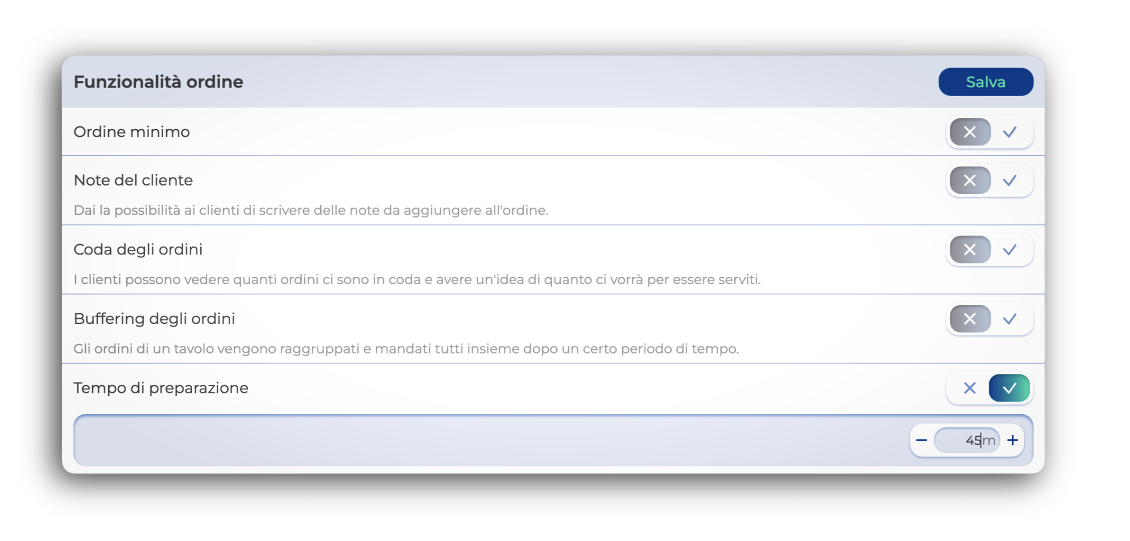 2Nella tabella Funzionalità ordine, individua l'impostazione Tempo di preparazione e inserisci il numero di minuti desiderato.