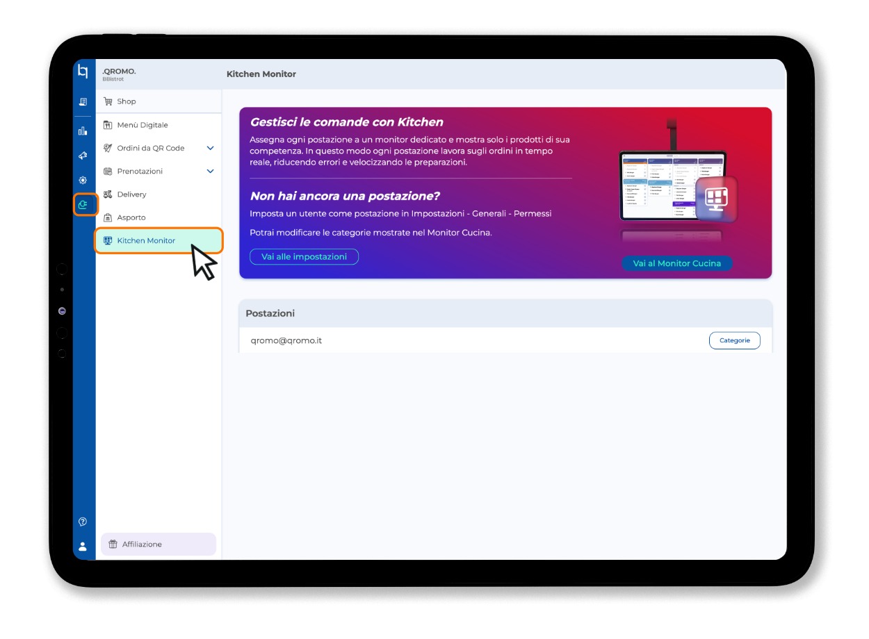 Il Kitchen Monitor è la funzionalità che sostituisce le comande cartacee, permettendo alla cucina di visualizzare e gestire gli ordini in tempo reale su uno schermo.