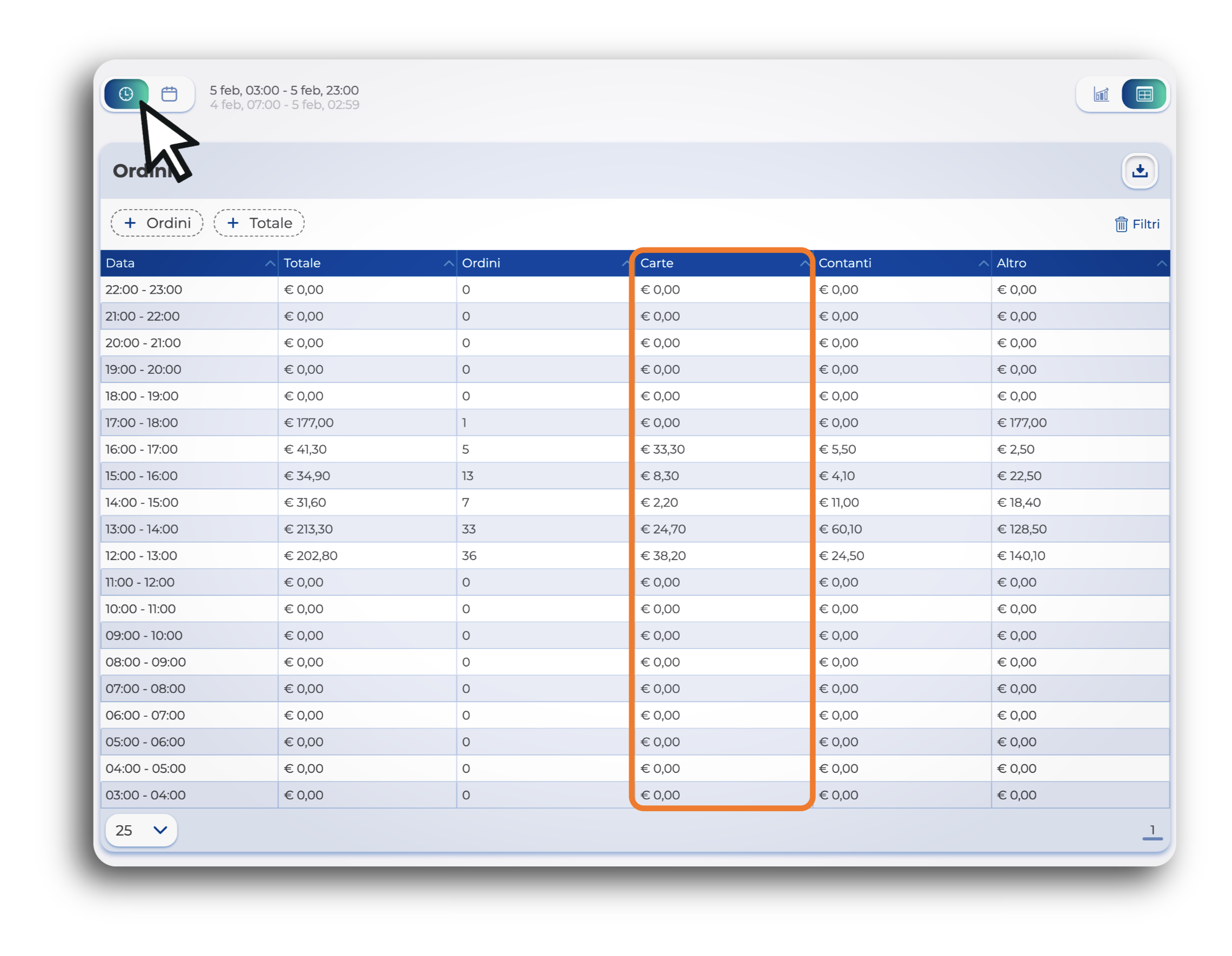 Sì, puoi controllare l'andamento dei tuoi incassi in base all'orario seguendo due strade diverse a seconda del livello di dettaglio che ti serve.