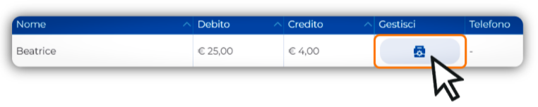 Individua il cliente o l'azienda per il quale vuoi caricare l'importo e fai click sull'icona nella colonna Gestisci.