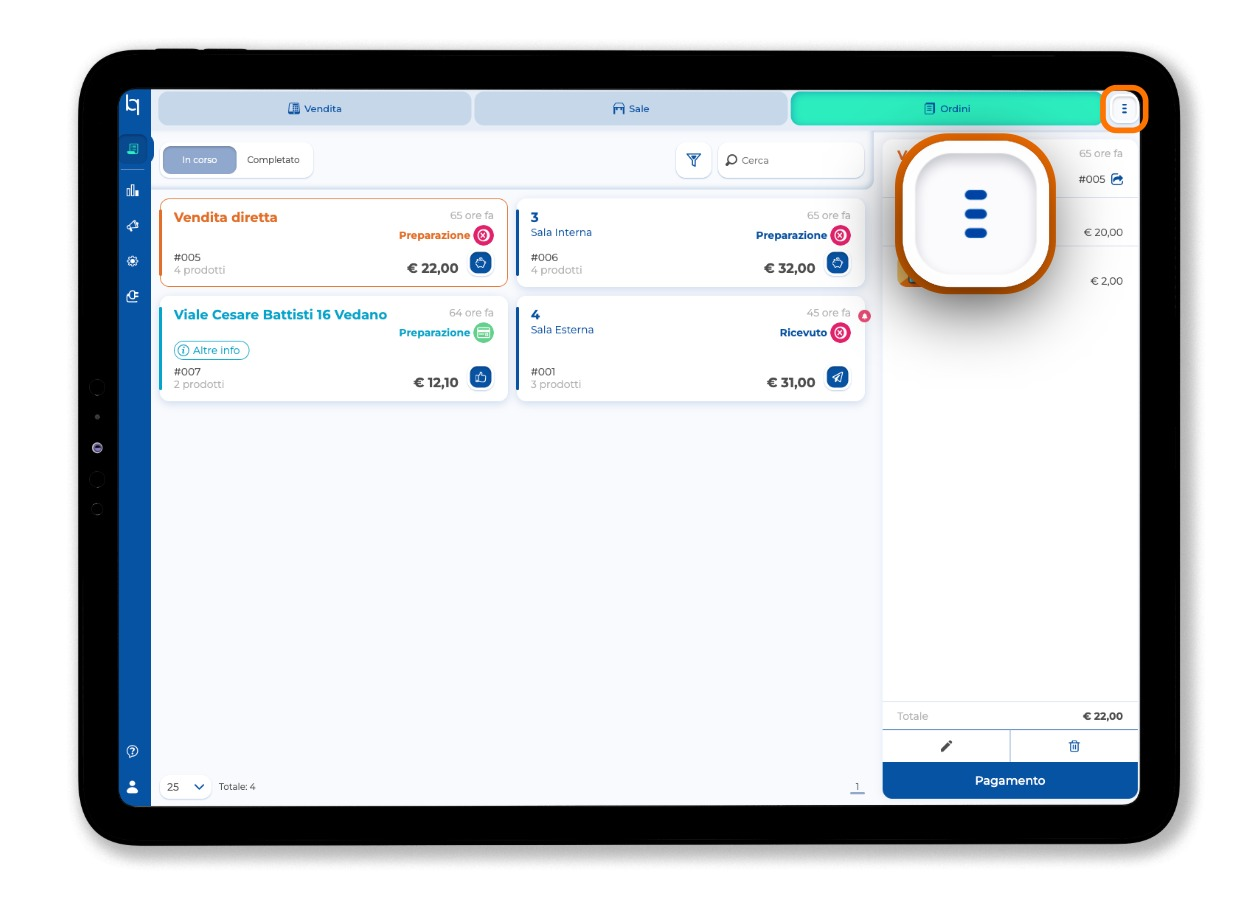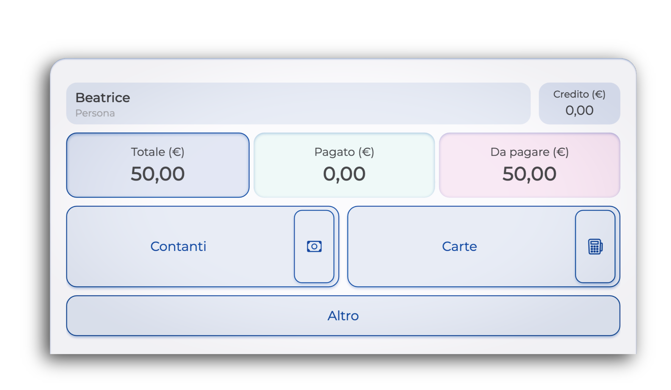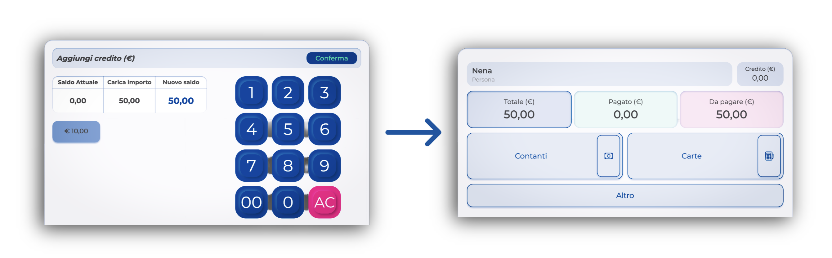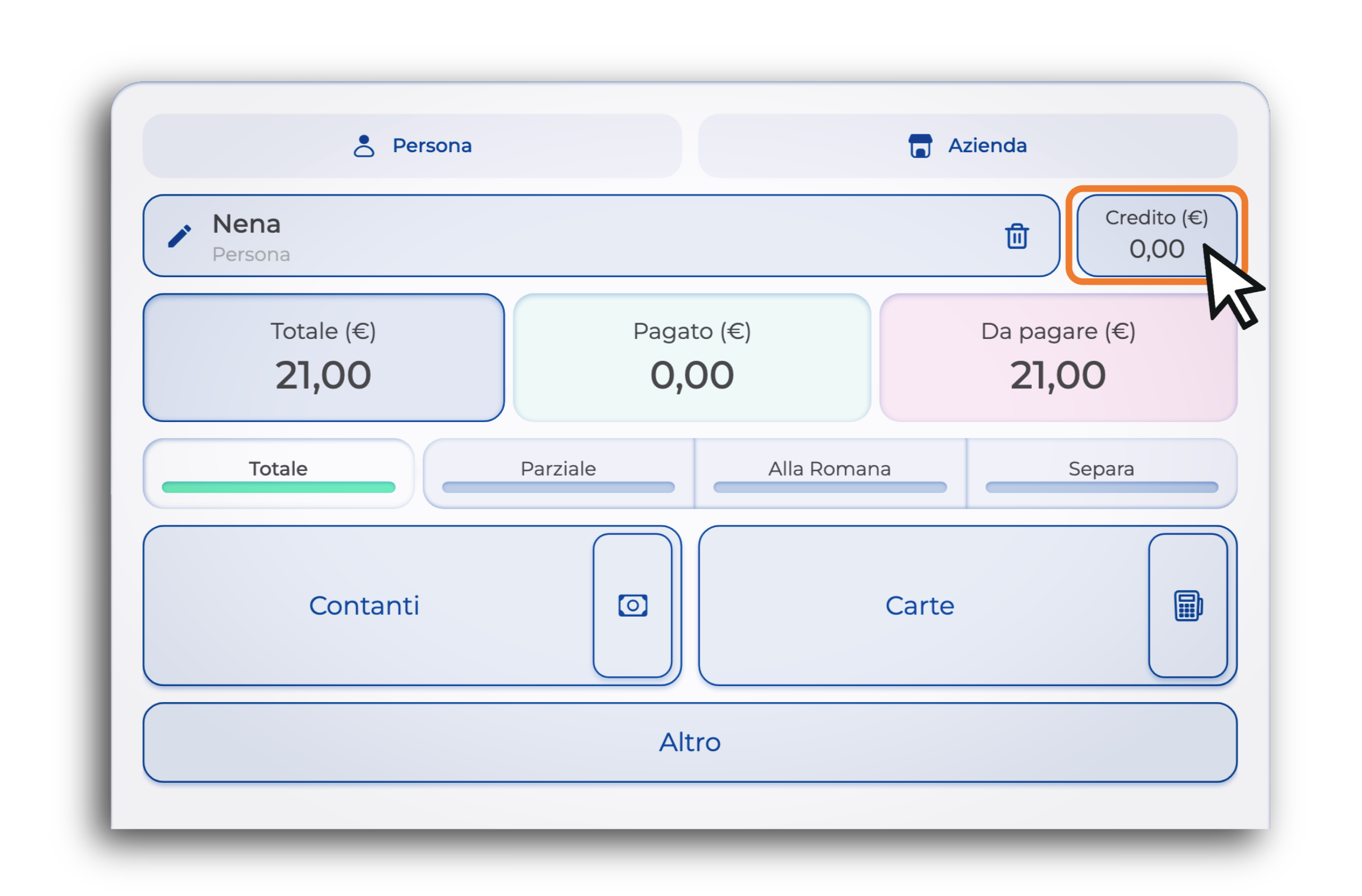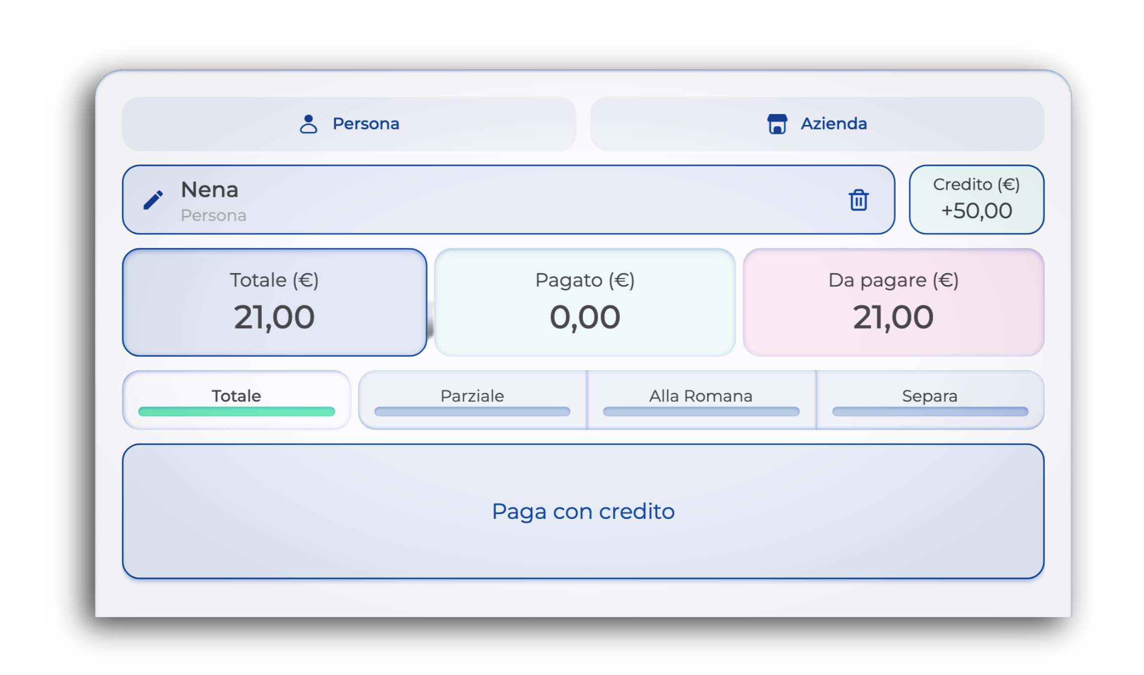 Se l'importo del credito è uguale o superiore al totale, il conto verrà completato e l'eventuale rimanenza resterà salvata in anagrafica.