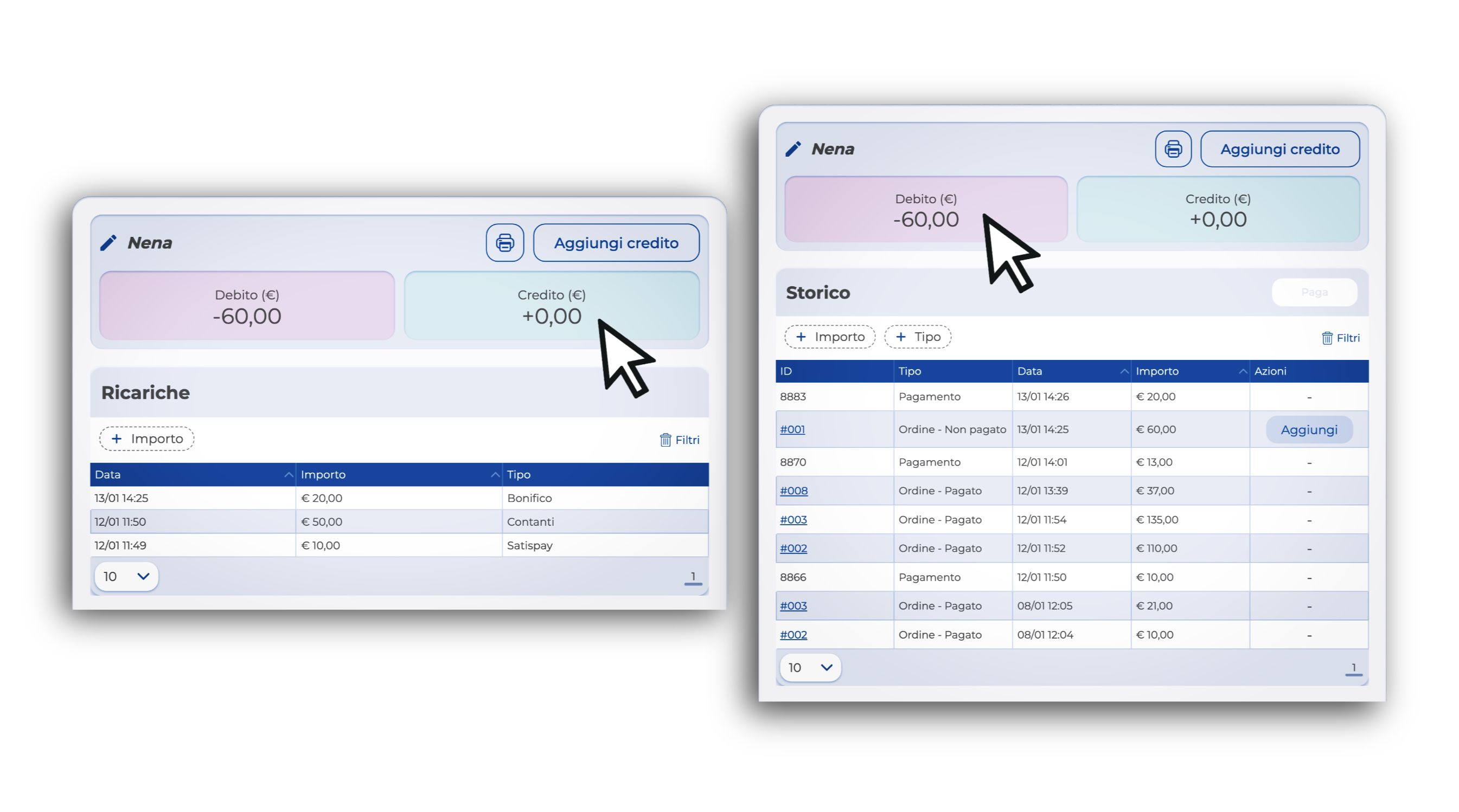 - Storico/Ricariche: In base alla tua selezione (Debito o Credito), puoi sfogliare l'elenco completo di tutti i movimenti effettuati dal cliente utilizzando i filtri